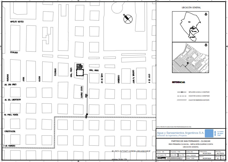 La obra se ubica en la zona del Canal de San Fernando, en un predio de la calle Quirno Costa e/ Gral. Arias y San Ginés, continuando por la calle Quirno Costa hasta la Av. Presidente Perón, donde la cañería a presión vuelca en una Boca de Descarga y Vertedero. A su vez, esta Boca de Descarga vuelca en una Boca de Registro perteneciente al colector Ribereños mediante una cañería a gravedad.