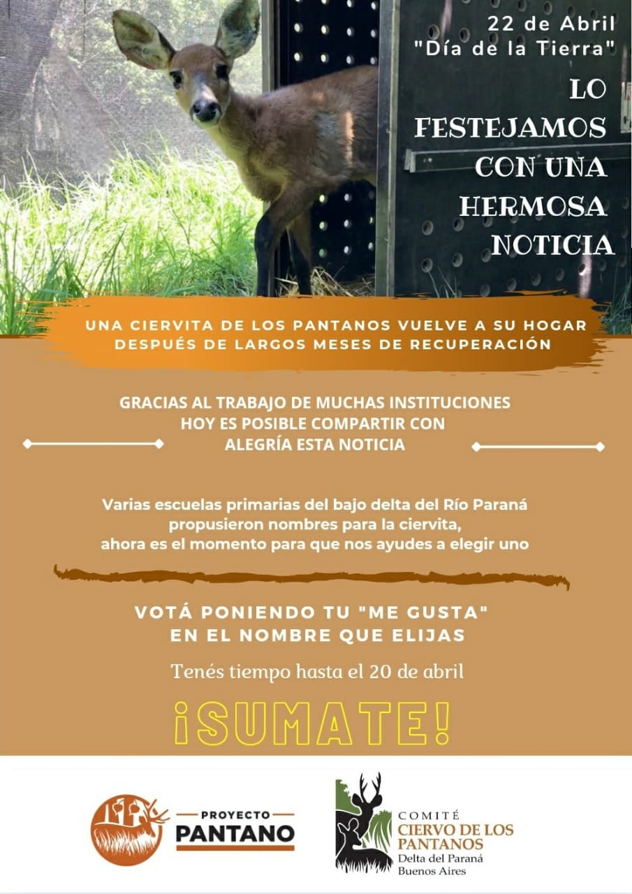 Una ciervita rescatada por el Comité Científico Técnico Ciervo de los Pantanos regresa a la isla luego de un largo período de recuperación. Hay cinco opciones propuestas por estudiantes de escuelas del Delta del Paraná. Para participar es necesario poner ME GUSTA en la foto que contiene el nombre elegido de la publicación