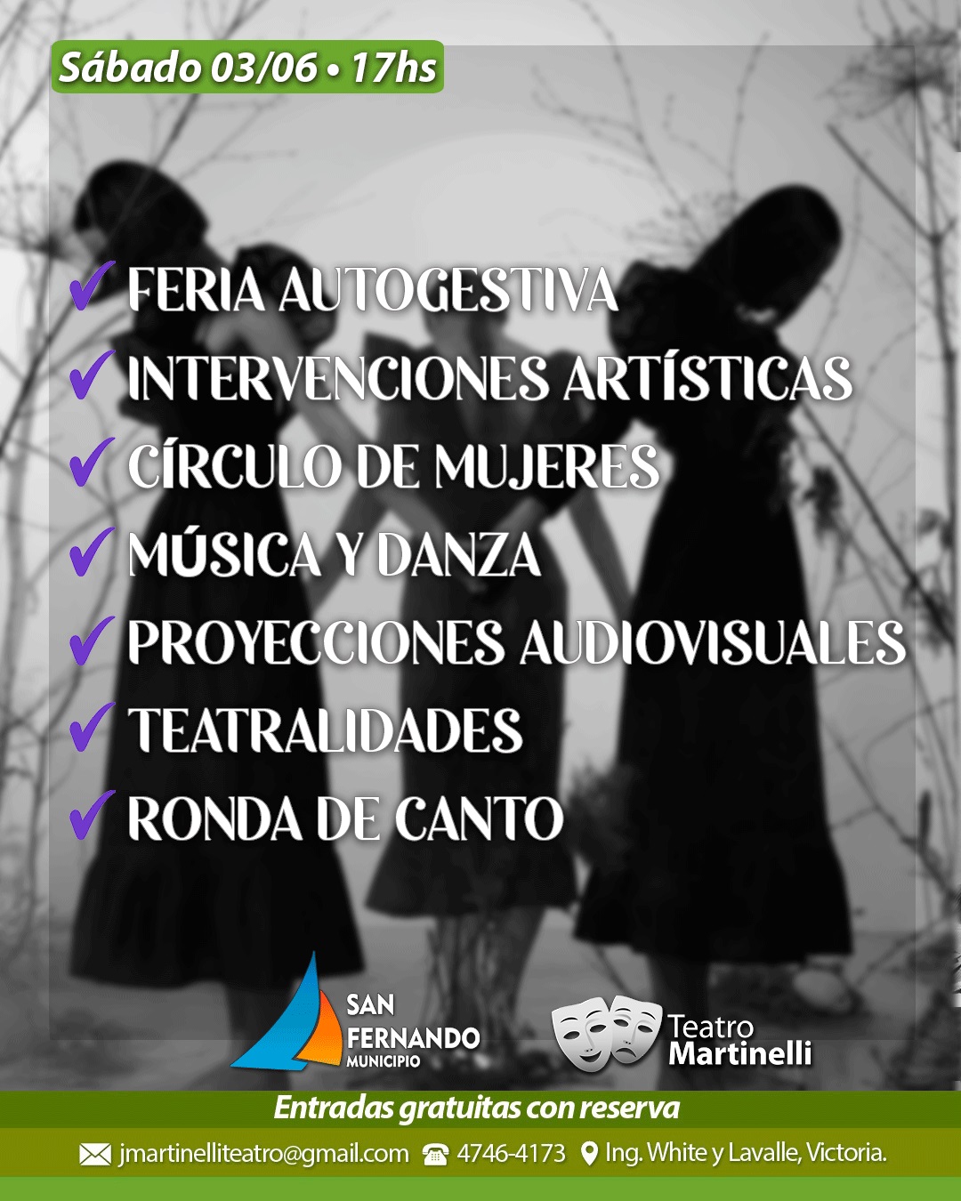 - Desde las 17 hs, actividades sin reserva previa: celebración en la calle, feria autogestiva, intervenciones artísticas, proyección de cortos, ronda de voces y un stand de área de Género.