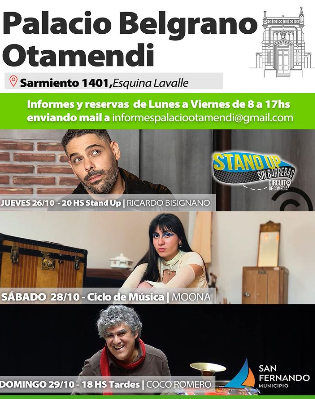 Los próximos jueves y sábado el Palacio Belgrano Otamendi abre sus puertas con tres propuestas diferentes, atravesadas por la música y el humor, para que vecinos y vecinas de nuestra ciudad puedan disfrutarlas.