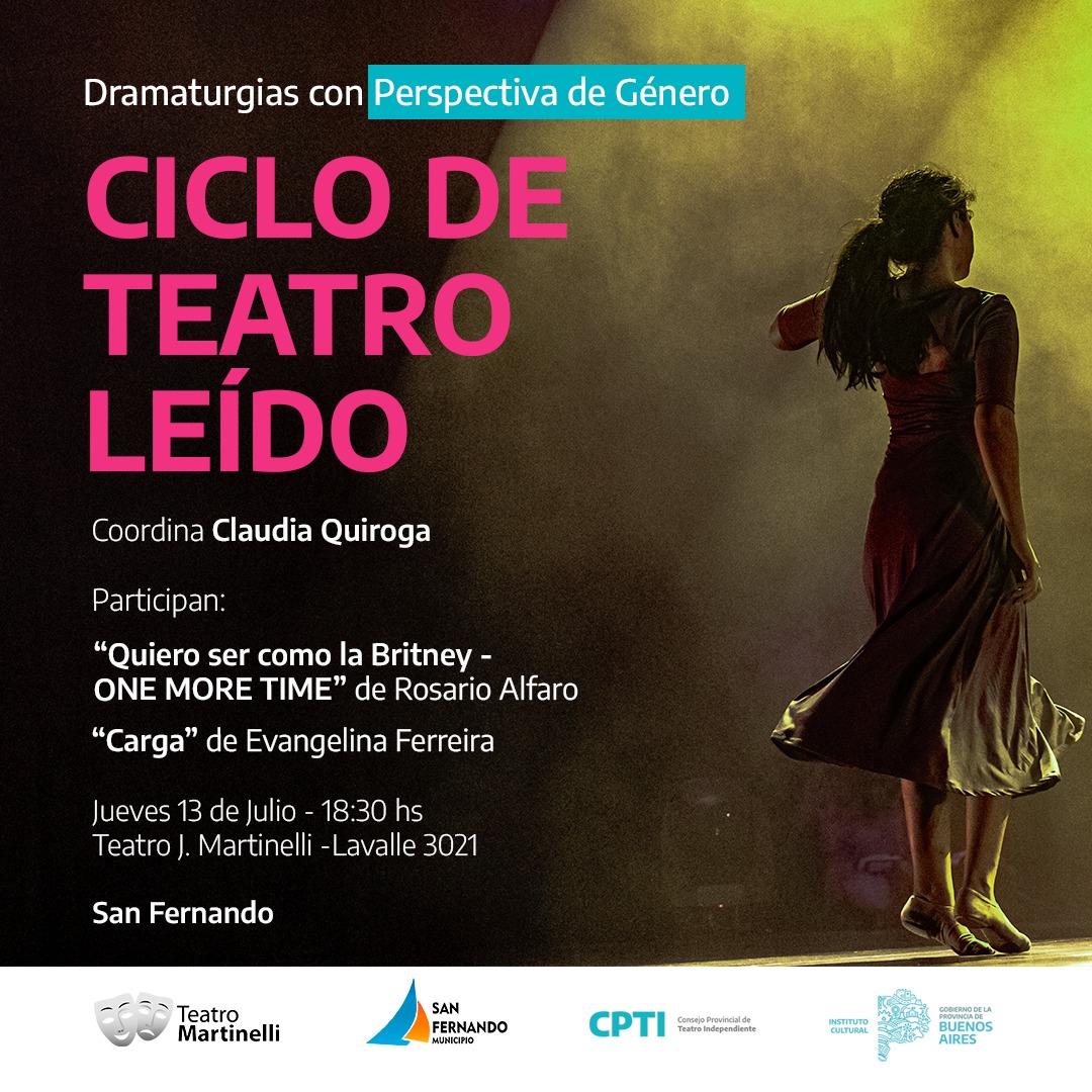 El Instituto Cultural en articulación con el CPTI lleva a cabo el Ciclo, con el fin de socializar las dramaturgias resultantes de la Clínica de Dramaturgia con Perspectiva de Género 2022 a cargo de la docente Claudia Quiroga. La misma se viene desarrollando en diferentes puntos de la provincia de Buenos Aires como lo fueron Pergamino, Bahía Blanca, Quilmes y La Plata.