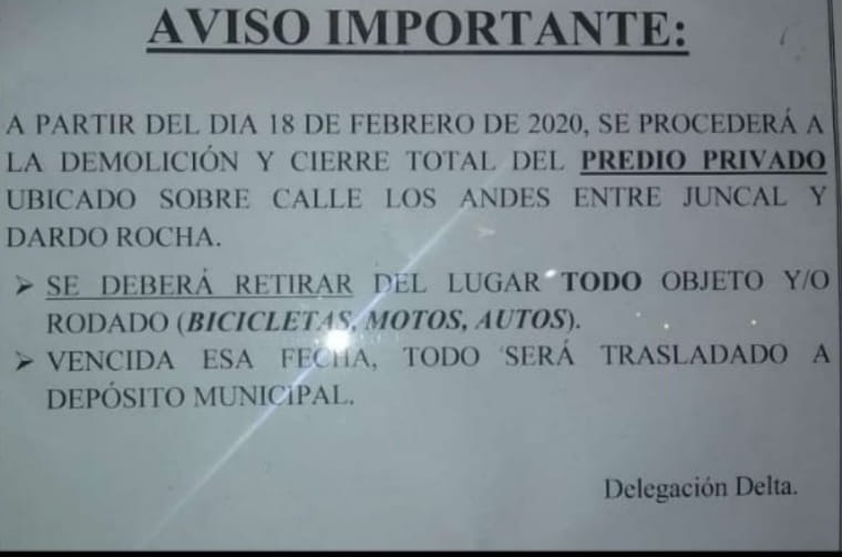 El viernes pasado el Municipio de Tigre, a través de la Delegación Delta, hizo circular una escueta nota que decía: “A partir del día 18 de febrero del 2020, se procederá a la demolición y cierre total del predio privado ubicado sobre la calle Los Andes entre Juncal y Dardo Rocha. Se deberá retirar del lugar todo objeto y/o rodado (bicicletas, motos, autos). Vencida esa fecha todo será trasladado a depósito municipal.” Tal novedad parecería ser el final de una historia de extraños ribetes que comenzó hace aproximadamente seis años.