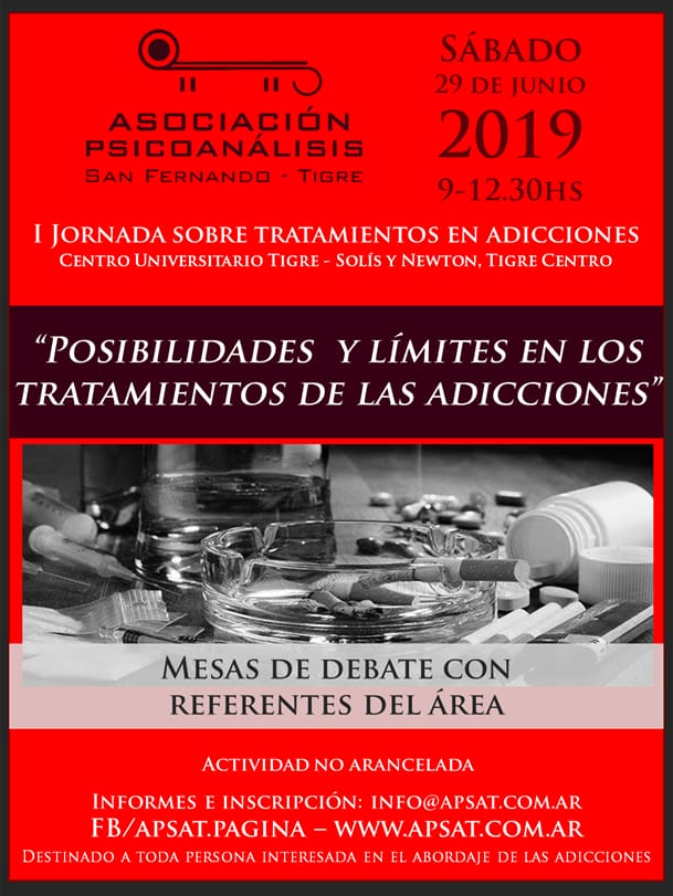 El sábado 29 de junio se llevará a cabo la I Jornada sobre tratamientos en adicciones: “Posibilidades y límites en los tratamientos de las adicciones”. La propuesta es organizada por la Asociación Psicoanálisis San Fernando – Tigre (APSaT) y realizará en el Centro Universitario de Tigre de 9 a 12.30, con entrada gratuita.