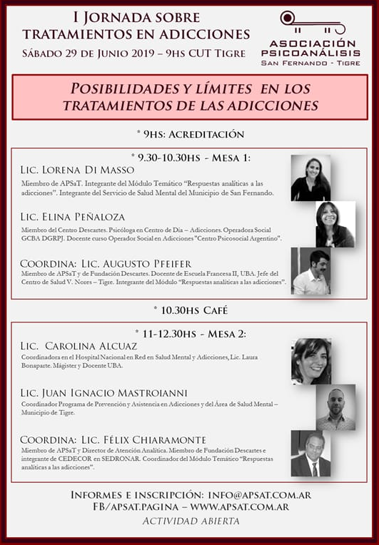 La jornada estará dividida en dos mesas de debate. De la primera participarán la licenciada Lorena Di Masso, miembro de APSaT, integrante del Módulo temático “Respuestas analíticas a las adicciones” y del Servicio de Salud Mental de la Municipalidad de San Fernando; la licenciada Elina Peñaloza, miembro del Centro Descartes, psicóloga en Centro de Día – Adicciones, operadora Social GCBA, DGRPJ, docente curso Operador Social en Adicciones “Centro psicosocial Argentino”. Coordinará el panel el licenciado Augusto Pfeifer, miembro de APSaT y de Fundación Descartes, docente de Escuela Francesa II, UBA, jefe del Centro de Salud V. Nores – Tigre e integrante del Módulo “Respuestas analíticas a las adicciones”.