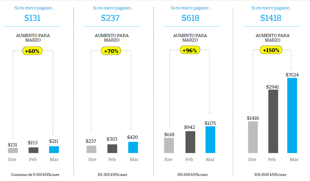 El último caso es para lo que consumen entre 600 y 1.500 kwh. En este segmento el tarifazo será el más alto: 148,5%. En enero estos usuarios pagaban $ 1.418 por mes, mientras que en marzo abonarán $ 3.524 como límite, unos $ 2.106 por encima del valor actual. Para los comercios la suba será igual que para los residenciales.