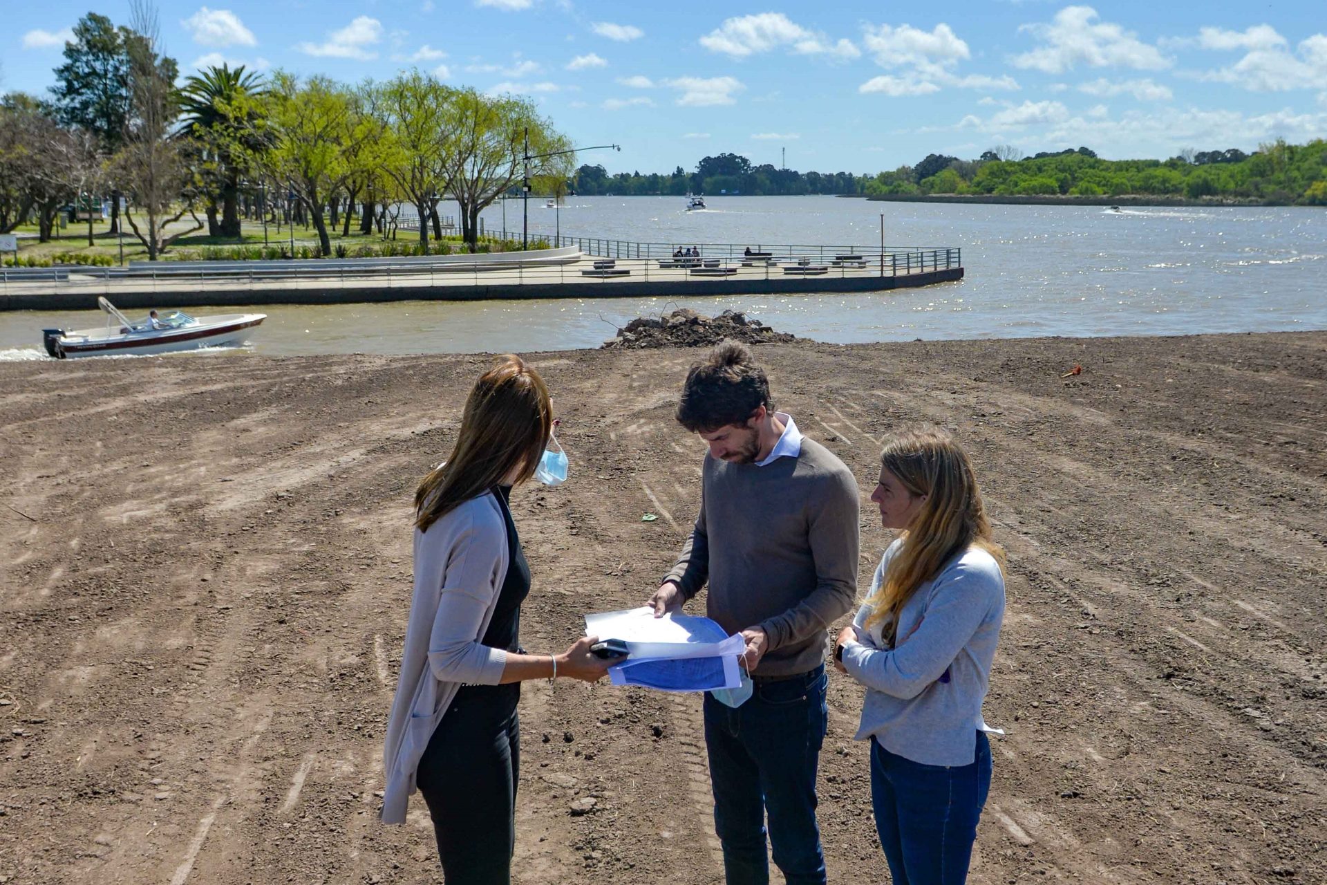 El intendente, Juan Andreotti; secretaria de Desarrollo Social, Educación y Medio Ambiente, Eva Andreotti; y la subsecretaria de Obras Públicas, Cecilia Tucat, recorrieron el avance de obra de ampliación del Parque Náutico, que permitirá que los vecinos disfruten de 2 hectáreas de espacio verde recuperadas frente al río.