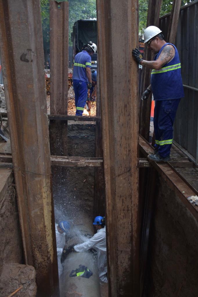 Una vez identificado que el problema era una fuga hidráulica en la unión entre dos cañerías maestras, el personal grandes conductos de la empresa acudió al lugar para comenzar con los relevamientos para la fabricación de las piezas especiales requeridas para la reparación de esta importante cañería.