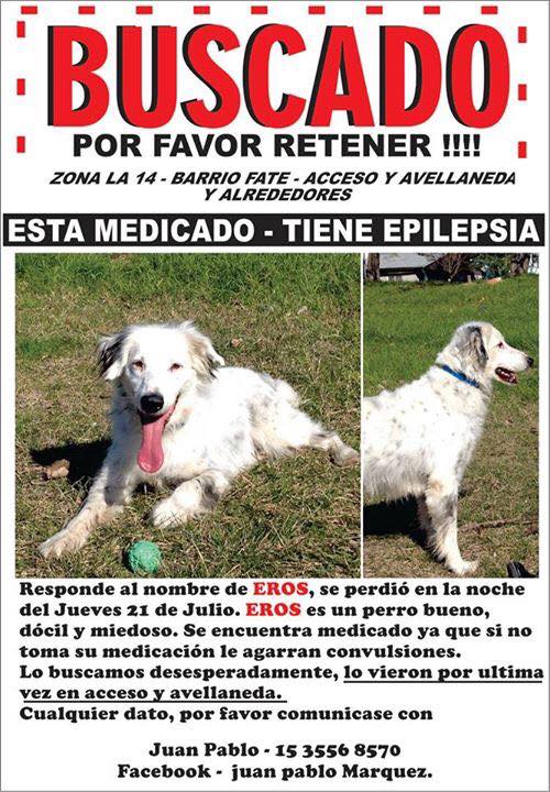 Juan Pablo Marquez busca a su perro Eros que se perdió el viernes pasado y que está en tratamiento ya que tiene epilepsia: “Lo ultimo que sabemos es que se lo vio el viernes por la mañana en Acceso y Avellaneda. Él toma su medicación CONTAL 60ml. por su epilepsia y si no la toma convulsiona”, comentó en la publicación.