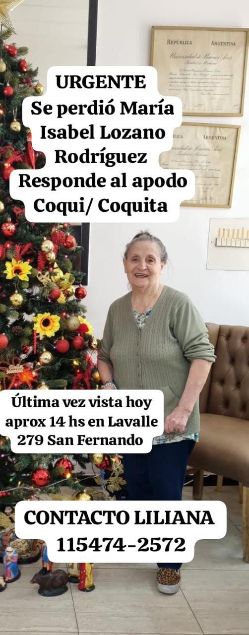 Se trata de María Isabel Lozano Rodríguez (apodo Coqui o Coquita), quien padece Alzheimer y ayer se escapó del geriátrico donde reside. El hecho fue ayer y la última vez que se la vio fue en Lavalle al 200 cerca de las 14 horas.
