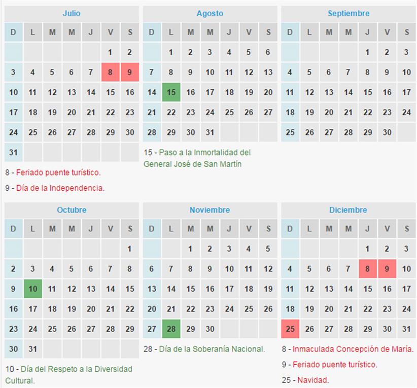 Después de ese día, quedarán cuatro feriados para el resto del año, uno de ellos puente y otro cae domingo: lunes 10 de octubre (Día del Respeto a la Diversidad Cultural); lunes 28 de octubre (Día de la Soberanía Nacional); jueves 8 y viernes 9 de diciembre (Día de la Inmaculada Concepción de María y feriado puente) y domingo 25 de diciembre (Navidad).