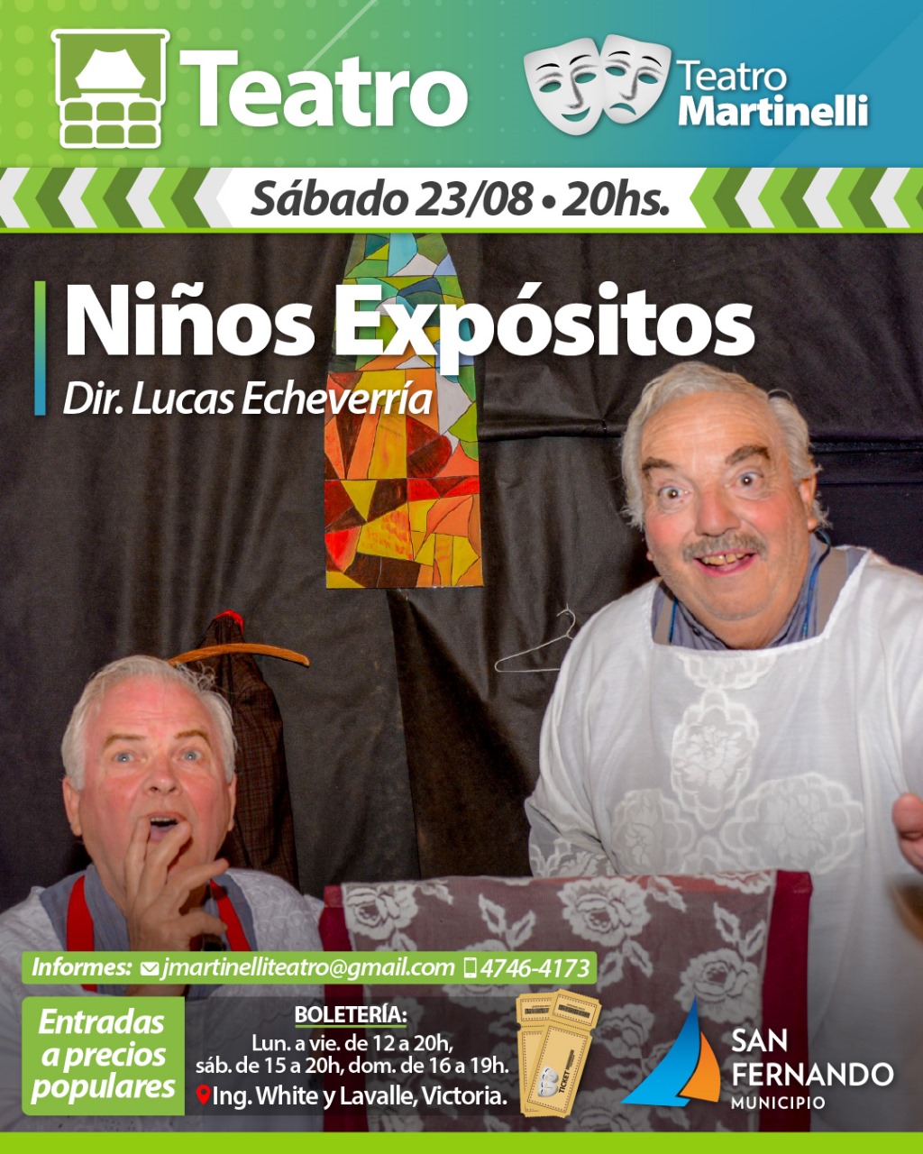 Entradas a precios populares. Boletería: lunes a viernes de 10 a 20 horas y sábados de 15 a 20 hs. en Ingeniero White y Lavalle, Victoria. Consultas por mail a jmartinelliteatro@gmail.com o al teléfono 4746-4173.