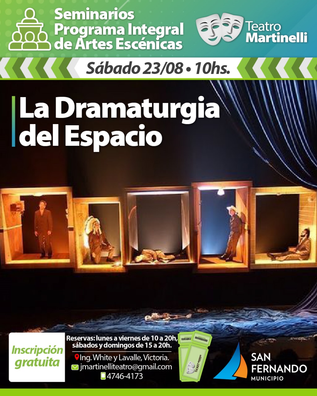 Más información en el Teatro. Lunes a viernes de 10 a 20 horas y sábados de 15 a 20 hs. en Ingeniero White y Lavalle, Victoria. Consultas por mail a jmartinelliteatro@gmail.com o al teléfono 4746-4173.