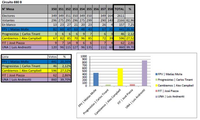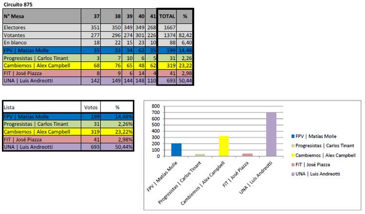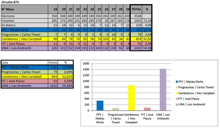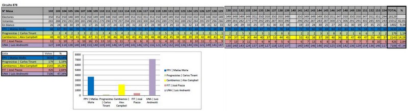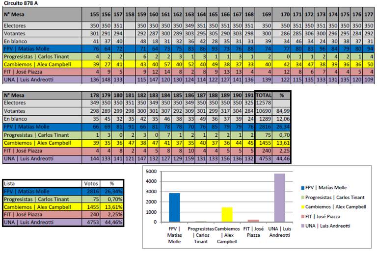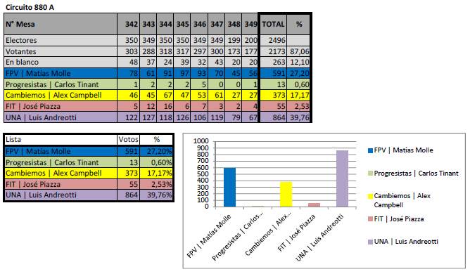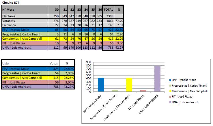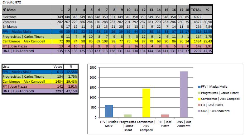 En el circuito 878 A, comprendido entre el acceso, el Río Reconquista, Ruta 202 y Avellaneda, en las PASO la fuerza que más votos había obtuvo fue el FPV que se impuso con más del 35%. En esta oportunidad, logró imponerse Luis Andreotti con la propuesta de UNA con el 44,46% de los votos.