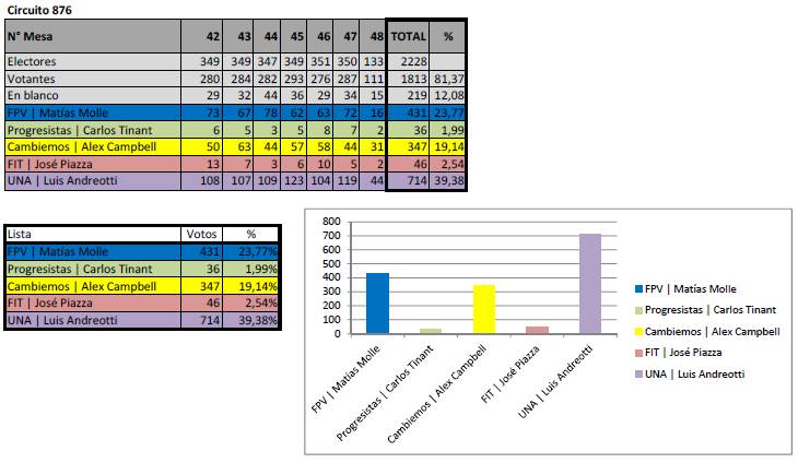 El circuito 877 nuclea los barrios San Rafael, Tiro Federal, 25 de mayo, Villa Nájera, Infico, Aviación, entre otros. Al igual que en las PASO la preferencia estuvo depositada en la figura del actual intendente. De 13.468 electores, el 45,71% eligió la propuesta de UNA (6.156 en total).