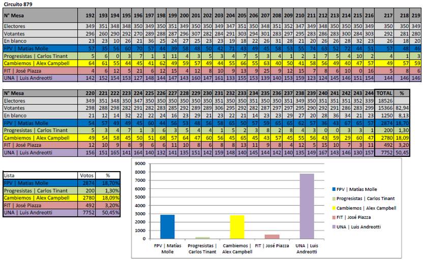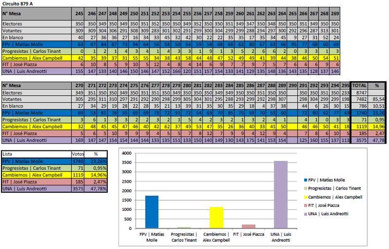 En el circuito 879 A el resultado fue similar al circuito anterior. En la zona comprendida entre el acceso, las vías del ramal no eléctrico, Avellaneda y río Reconquista, se impuso Luis Andreotti con un 47,78% de los votos.