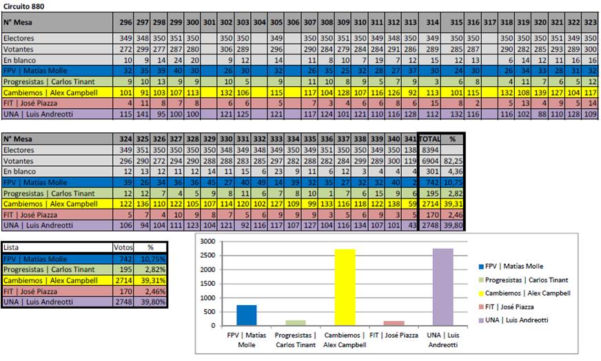 En el circuito 879 que comprende los barrios Santa Rosa, Mil Viviendas, el Pueblito, entre otros, el resultado fue 50,45% para Luis Andreotti. De 15.366 ciudadanos que emitieron su voto, 7.752 eligieron al actual intendente.