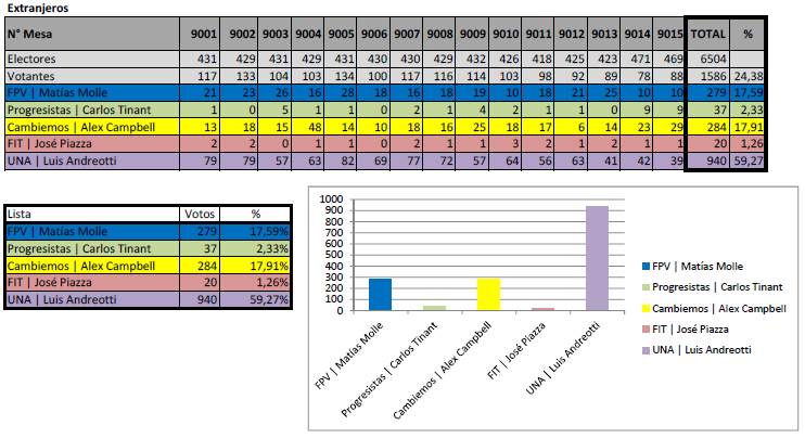 En la totalidad de las 15 mesas preparadas para el voto de extranjeros, el intendente Luis Andreotti resultó ganador con el 59,27% de los votos.