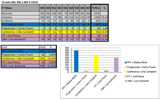 A diferencia de lo que ocurrió en el continente en donde el jefe comunal resultó el candidato más votado, en la zona del Delta fue el tercero detrás de Matías Molle y Alex Campbell. El FPV ganó con el 31,52% de los votos, diez puntos arriba de los obtenidos por el actual intendente.