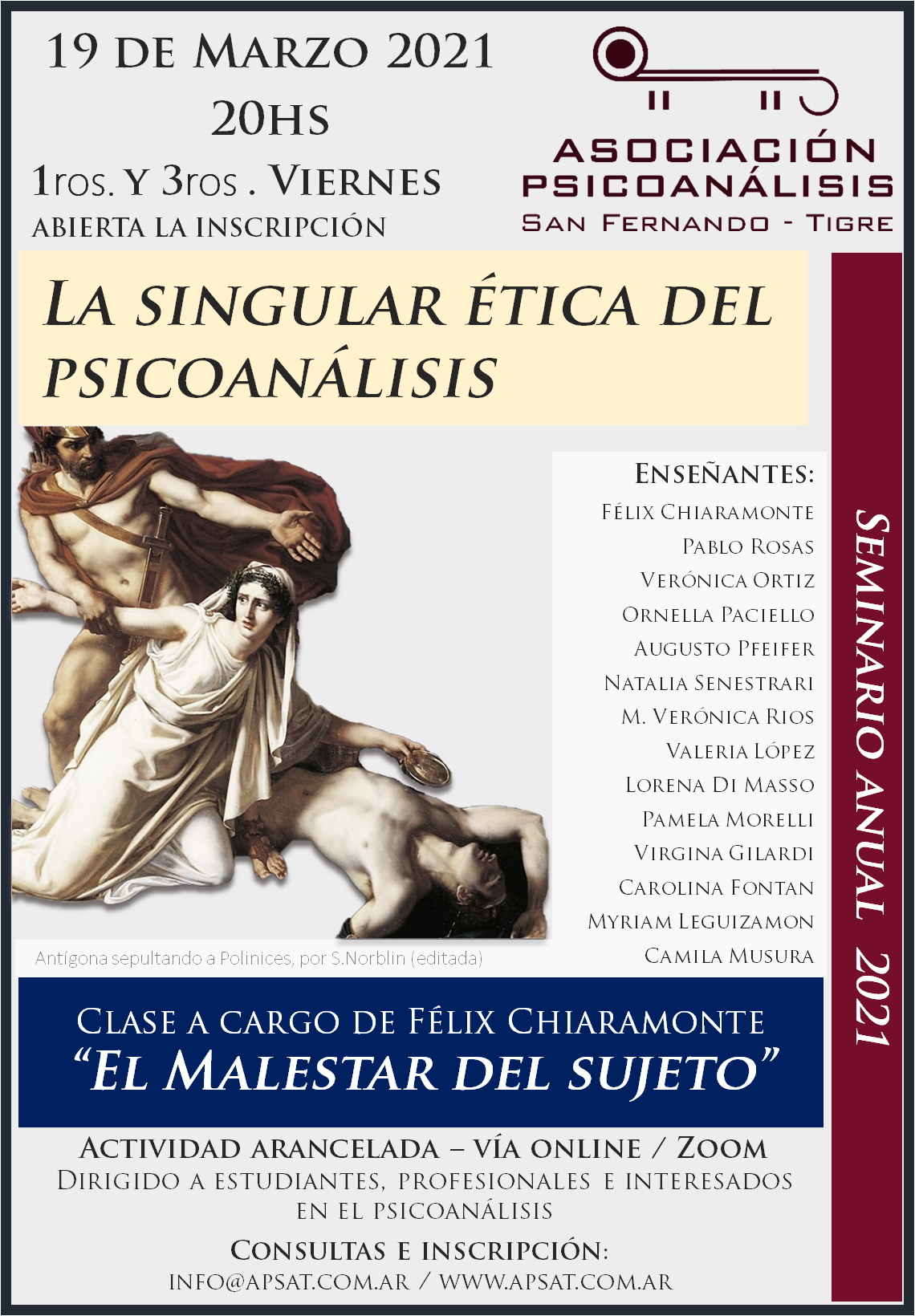 La Asociación de Psicoanálisis San Fernando-Tigre (APSaT) organiza el seminario de lectura anual La singular ética del psicoanálisis. La actividad comienza el viernes a las 20 hs por Zoom y se llevará a cabo los primeros y terceros viernes de cada mes.