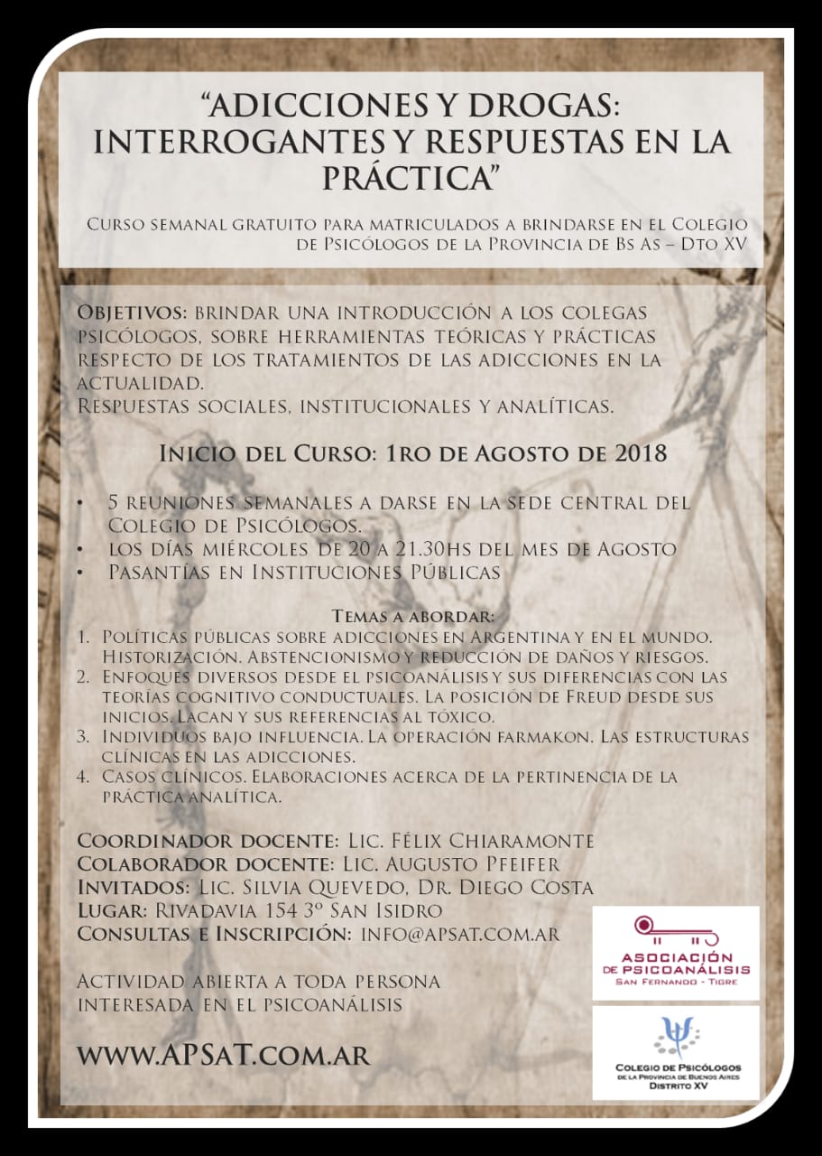 El curso comenzará el miércoles 1° de agosto a las 20hs en el Colegio de Psicólogos de la Provincia de Buenos Aires Distrito XV, ubicado en Rivadavia 154, 3° piso, San Isidro.