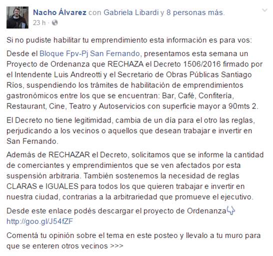 “Si no pudiste habilitar tu emprendimiento esta información es para vos”, dice el posteo realizado en Facebook desde la cuenta del concejal del Frente para la Victoria, Nacho Álvarez y comienza a explicar que desde el Bloque Fpv-Pj San Fernando presentaron un proyecto de Ordenanza que rechaza el Decreto 1506/2016 firmado por el intendente Luis Andreotti y el secretario de Obras Públicas Santiago Ríos y que “suspende los trámites de habilitación de emprendimientos gastronómicos como bar, café, confitería, restaurant, cine, teatro y autoservicios con superficie mayor a 90 mts2″.