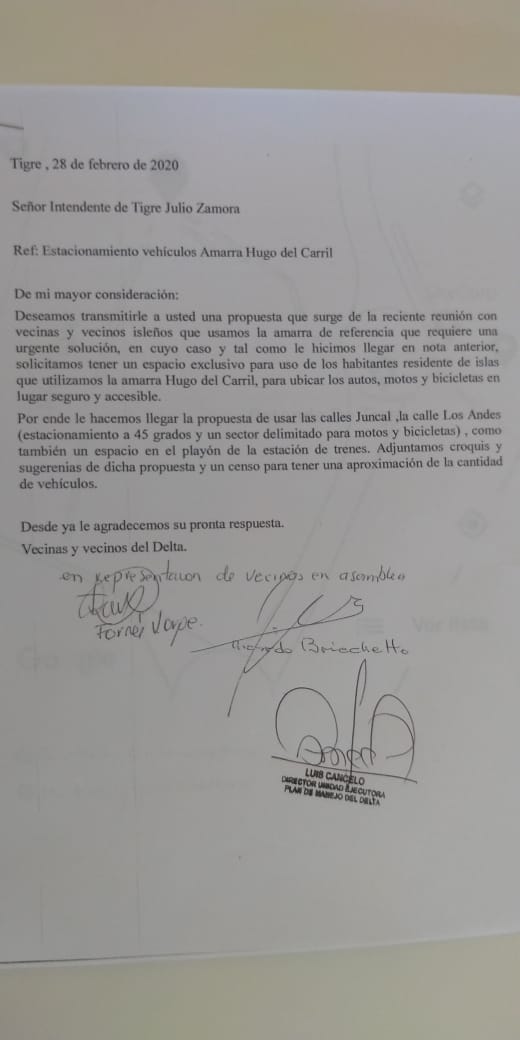 Por tal motivo los isleños se agruparon para diseñar y presentar al intendente de Tigre, Julio Zamora un proyecto de estacionamiento exclusivo que les permita tener un fácil y seguro acceso a las amarras Hugo del Carril. A partir de un exhaustivo relevamiento que incluye nombre, apellido, número de documento, río o arroyo del solicitante, patente, marca y tipo de vehículo se acordó a través de una asamblea solicitar el permiso para estacionar a cuarenta y cinco grados sobre las calles Juncal y Los Andes, que son el acceso y la paralela, respectivamente, a las amarras isleñas. Por otra parte, como ese espacio resultaría exiguo, se pide también cierta cantidad de plazas en el playón de la estación de tren. De esta forma, y con la colocación de alguna cámara de vigilancia extra se obtendría, según manifiestan los vecinos, un lugar que brindaría cierta seguridad y proximidad al punto de ingreso y salida de sus embarcaciones.