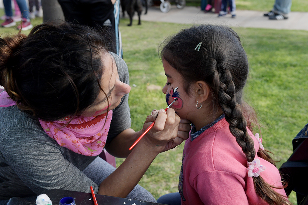 Y Joana, con su hija Mía, agregó: “Me encanta. El día está lindo, aprovechamos y la traje a ella. Está re contenta, le gustan los peloteros y que les pinten la cara. Nos regalaron golosinas y tenemos un número para los sorteos”.