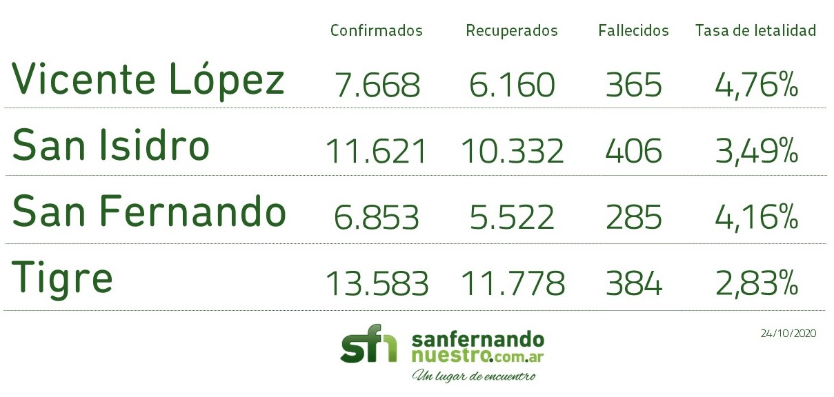 En lo que respecta a la Región Metropolitana Norte, es decir, los municipios de Vicente López, San Isidro, San Fernando y Tigre, los registros no llegan al 9% en comparación al total para PBA: 39.725 (7.60%) de confirmados y 1.440 (8.72%) fallecidos. En la siguiente imagen está el desagregado por municipio.