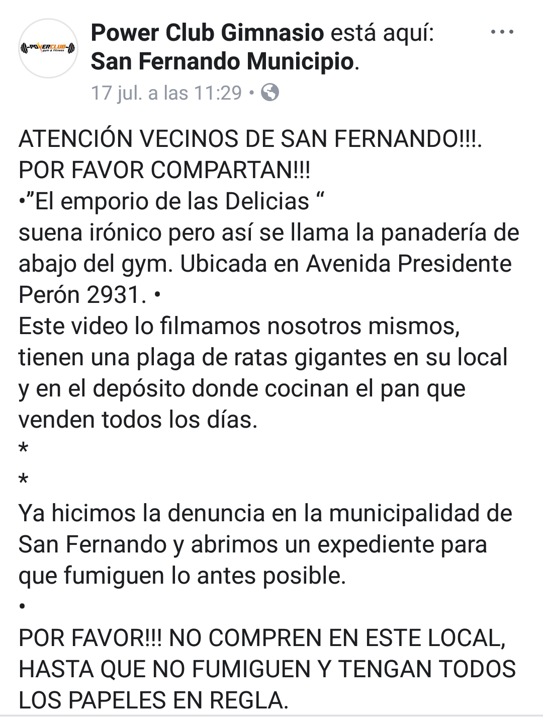 “Yo quiero que fumiguen lo antes posible, eso es por lo que estoy luchando. La panadería está cerrada al público pero siguen produciendo mercadería, escucho los hornos prendidos y la gente trabajando. Di aviso a la municipalidad y volvieron para poner mas fajas de clausura. Llamé a un fumigador para que fumigue mi negocio y viene mañana, tengo terror que suban acá”, expresó Marcos y agregó que “por el tamaño de las ratas, no son lauchitas. Son gigantes, yo las vi y tengo testigos aparte de los videos”.