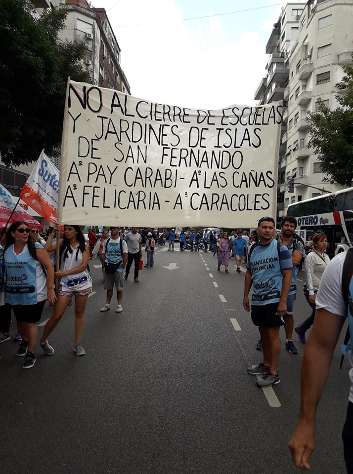 Al igual que Zamora, gremios de la zona aprovecharon la marcha para hacer visible la problemática que afecta a las comunidades isleñas. Tal es el caso de Suteba San Fernando que desplegó una bandera que mencionaba los arroyos en donde está ubicadas las escuelas y jardines que el gobierno María Eugenia Vidal quiere cerrar para “optimizar recursos”.