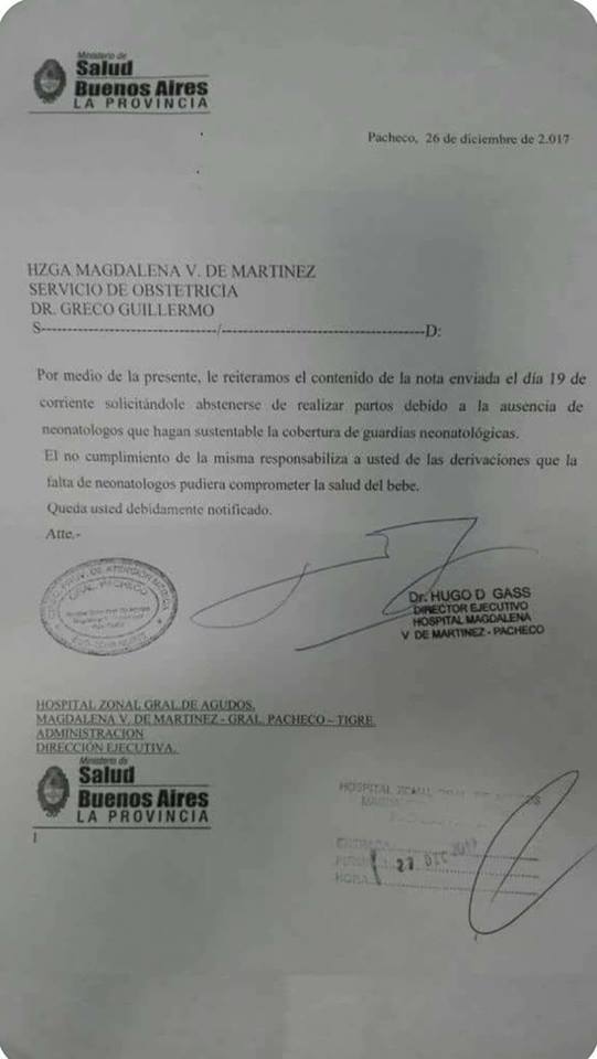 Compartimos el memo del Hospital de Pacheco en el que le solicitan al área de Obstetricia a “abstenerse de realizar partos debido a la ausencia de neonatólogos”