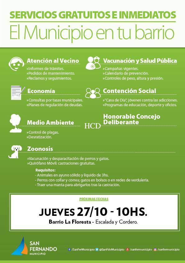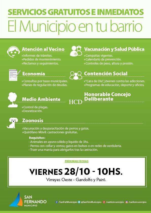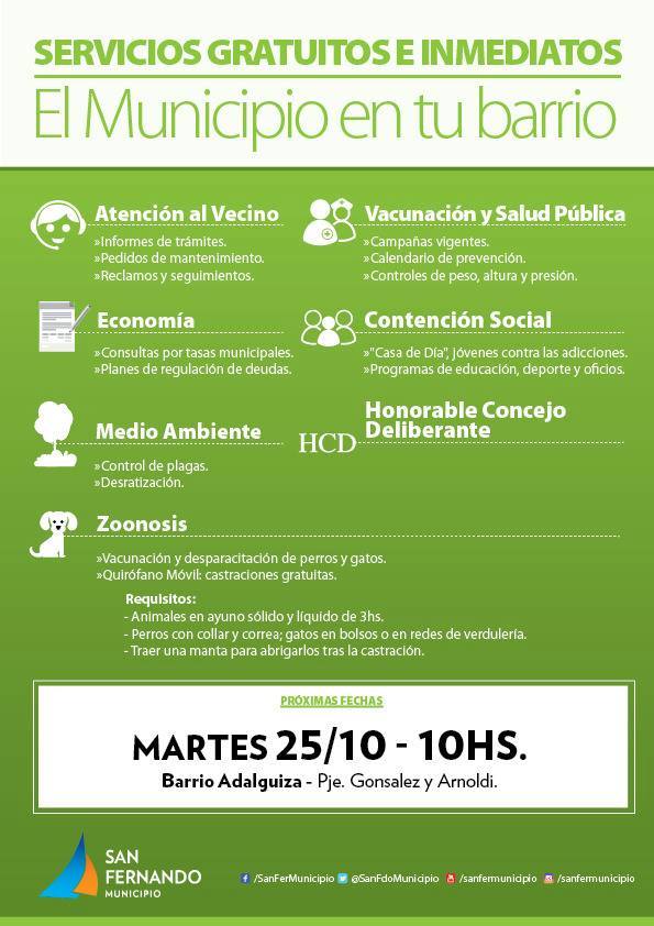El Programa ‘El Municipio en tu Barrio’ es una propuesta que facilita a la gente el acceso a servicios de distintas áreas de forma masiva, gratuita e inmediata. Entre los servicios presentes en los barrios, estarán control de plagas y desratización, la Unidad Móvil de Vacunación, el Quirófano Móvil de Zoonosis (con castraciones, desparasitaciones e inyecciones antirrábicas para perros y gatos), la oficina de Atención al Vecino, entre otros.