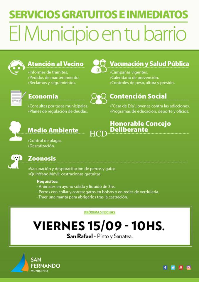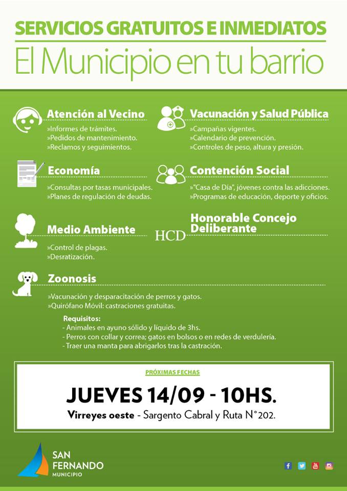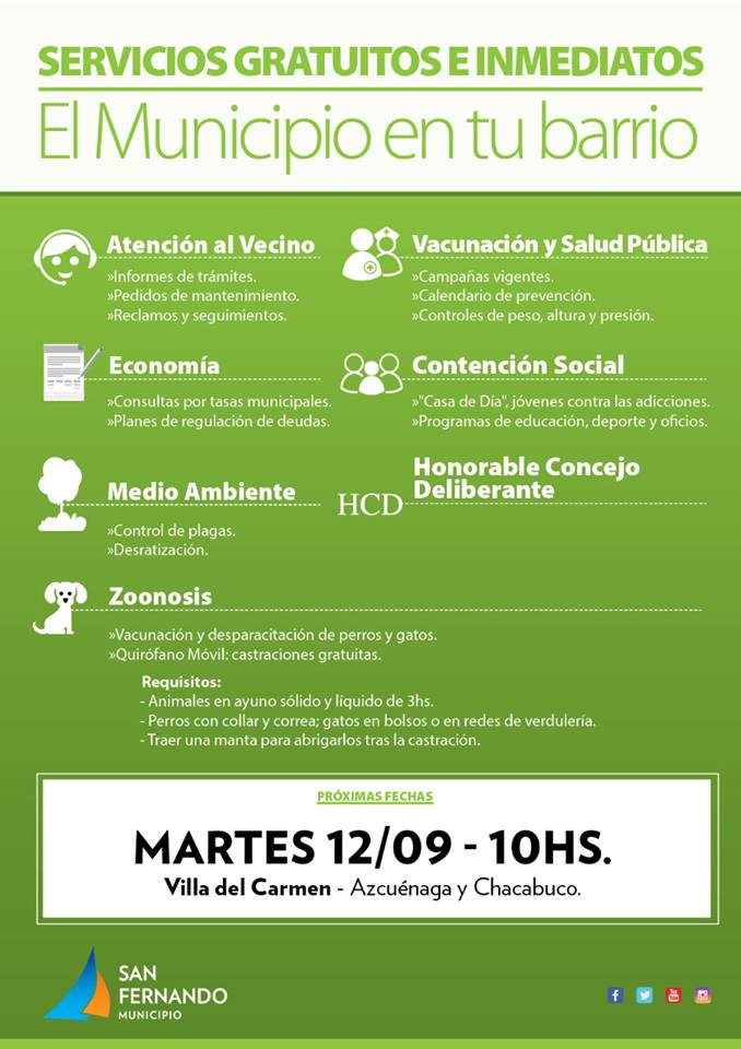 Este programa municipal acerca a los barrios los servicios de Atención al Vecino, Zoonosis, Salud Pública y varias secretarías municipales estará mañana en el barrio Villa del Carmen (Azcuénaga y Chacabuco); el jueves en Sargento Cabral y Ruta 202; y el viernes en el barrio San Rafael (Gral. Pinto y Sarratea).