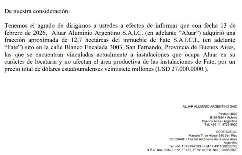 compra de aluar en fateCuatro días antes de este hecho, el 13 de febrero, Aluar comunicó una decisión llamativa: compró un terreno de 12,7 hectáreas que alquilaba dentro del predio de la compañía de neumáticos. La operación involucró un pago de u$s27 millones.