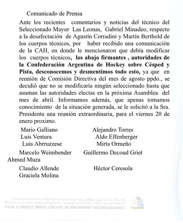 Ayer se sumó un nuevo capítulo al escándalo. Tras aquellas declaraciones de Minadeo, un grupo de dirigentes de la Confederación emitió un comunicado en el que desmiente haber tenido conocimiento y participación de dichas decisiones. “Ante los recientes comentarios […] del técnico del seleccionado mayor, las Leonas, Gabriel Minadeo […] los abajo firmantes, autoridades de la Confederación Argentina de hockey sobre césped y pista, desconocemos y desmentimos todo esto”.