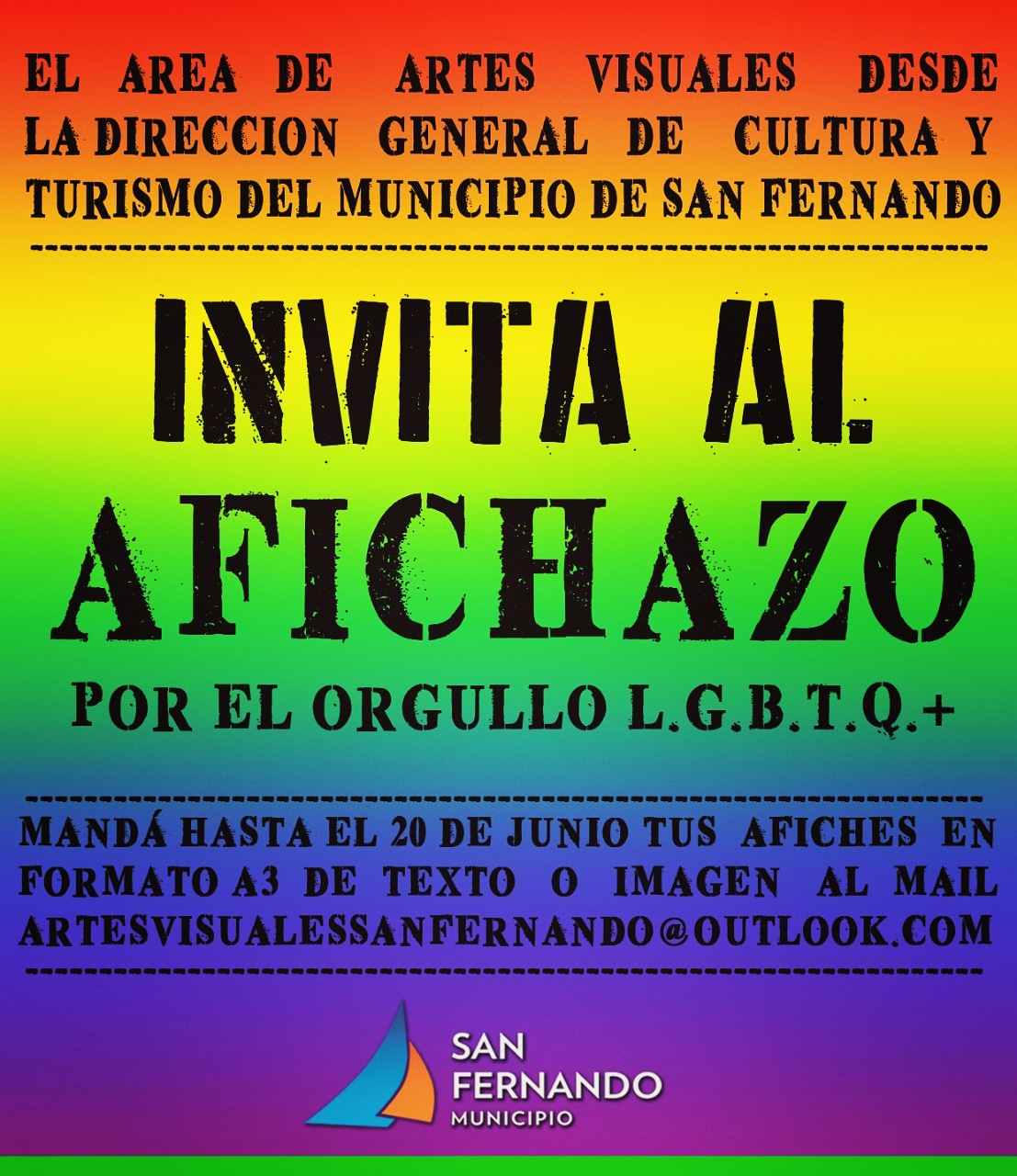 La Dirección General de Cultura y Turismo del Municipio, desde el Área de Artes Visuales, lanzó la propuesta “Afichazo” por el orgullo LGBTQ+, en el marco del mes del orgullo. Esta consiste en una convocatoria para que los vecinos envíen afiches realizados en cualquier técnica, de imagen o texto, para alzar la voz por los derechos de la comunidad LGBTIQ+. Para participar es necesario enviar el afiche a artesvisualessanfernando@outlook.com antes del 20 de junio.