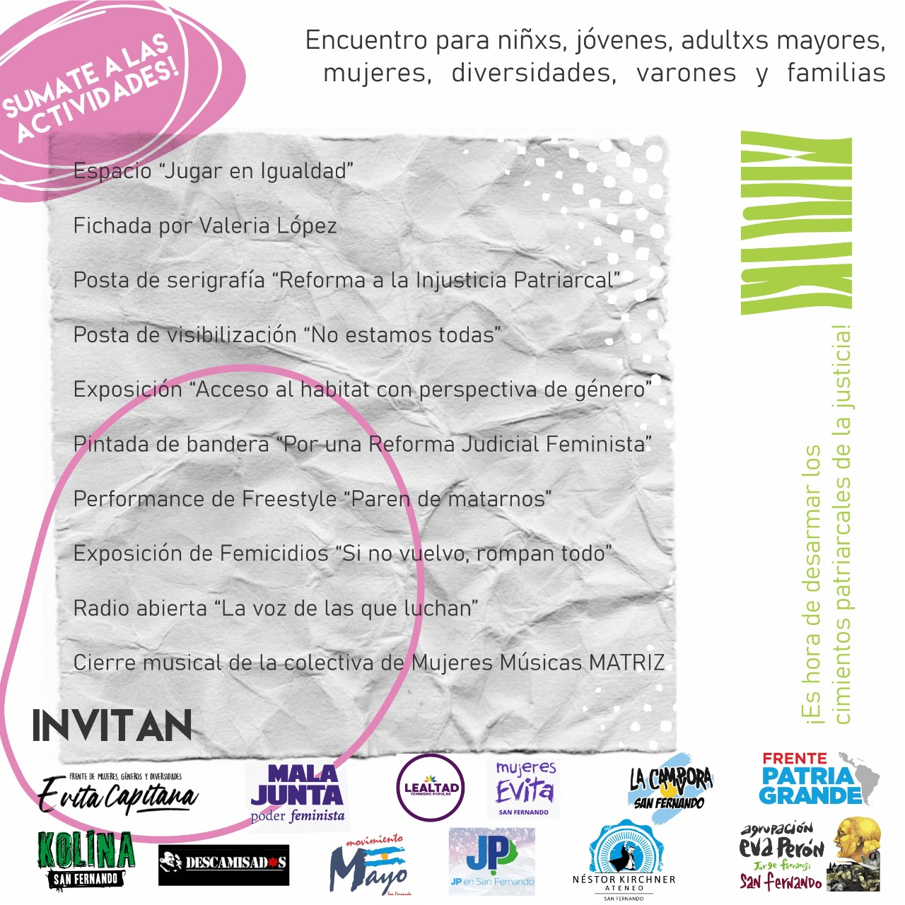 Convocan: Ateneo Nestor Kirchner San Fernando, La Campora San Fernando, Agrupación “Eva Perón” Jorge Ferraresi San Fernando, Kolina San Fernando, Movimiento Mayo, Mujeres Evita San Fernando, Mala Junta Poder Feminista, JP en San Fernando, Frente de Mujeres, Géneros y Diversidades Evita Capitana, Descamisadxs, La Néstor Vive – Mujeres, genero y diversidades, Lealtad, Frente Patria Grande