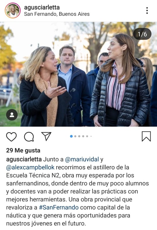 WhatsApp Image 2019-09-03 at 22.45.16Según publicó en su cuenta la concejal y candidata a intente de Juntos Por el Cambio, Agustina Ciarletta, la gobernadora visitó la ciudad para recorrer el astillero de la Escuela Técnica N° 2. “Junto a @mariuvidal y @alexcampbellok recorrimos el astillero de la Escuela Técnica N2, obra muy esperada por los sanfernandinos, donde dentro de muy poco alumnos y docentes van a poder realizar las prácticas con mejores herramientas. Una obra provincial que revaloriza a #SanFernando como capital de la náutica y que genera más oportunidades para nuestros jóvenes en el futuro”, posteó Ciarletta.