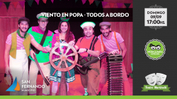 Por último, el domingo 9 de septiembre a las 17 horas se presentará ‘Viento en Popa’ con la obra “Todos a bordo”, en el marco de un Ciclo de Música Infantil. La Capitana y Sabiondo esperan en el puerto la llegada de los marineros para levar anclas y emprender un viaje musical arriba del barco de Viento en popa. Navegarán distintas costas y también lugares difíciles de acceder en barco. Durante este paseo irán descubriendo canciones y ritmos, que cuentan historias, proponen juegos e invitan a todos a cantar.