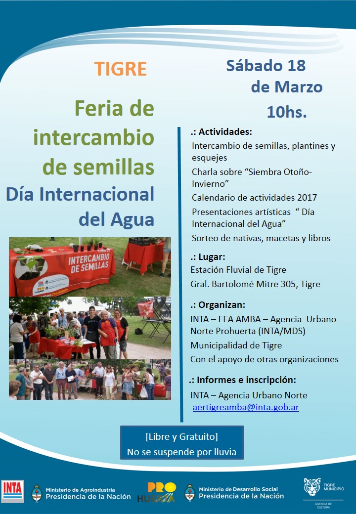 Organizado por INTA, PROHUERTA, el Municipio de Tigre y Vientos de Siembra, entre otras organizaciones de la comunidad, el encuentro se presenta como una feria para intercambiar semillas, plantines y gajitos. Además se realizará una charla sobre la siembra otoño-invierno, presentación artística de “Día Internacional del Agua”, y sorteos de nativas, macetas y libros.