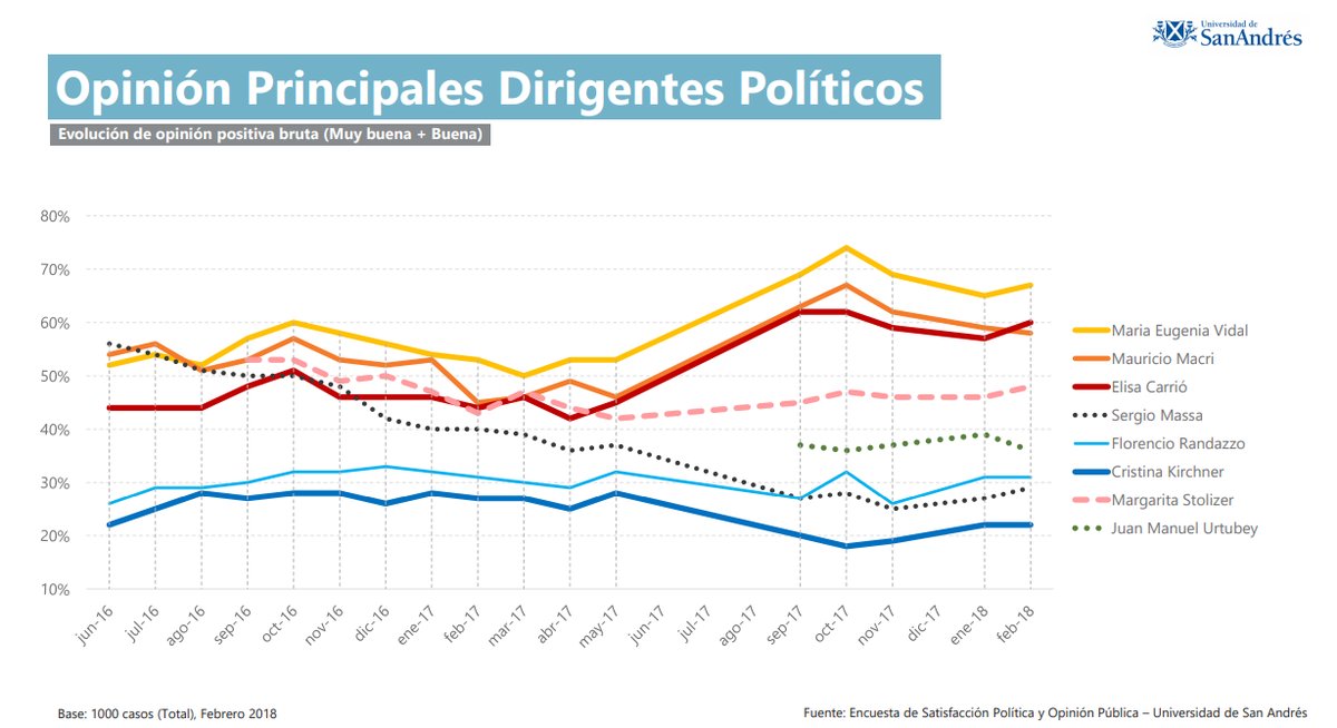 60% de imagen positiva neta. Los ministros son fusibles, se pueden cambiar y con ello volver a conectar el sistema eléctrico. El riesgo es cuando el dueño de casa, el que cambia los fusibles, ha perdido la capacidad para hacerlo. No es el caso del Presidente que, si bien la aprobación de su gobierno está experimentando una caída (del 66% al 52%), aún mantiene una buena posición: su imagen positiva neta es del 60%. De todos modos, no es el único. La gobernadora María Eugenia Vidal, que ha experimentado también una “caída”, ha logrado mantener un inmejorable 72% de imagen positiva neta, muy por encima de su jefe político. Quien se encuentra en una buena posición es su socia Elisa Carrió (65% de imagen positiva neta), que por primera vez ha superado al Presidente en la opinión pública. Cualquiera sea el caso, los tres se encuentran aún con respaldo y bien posicionados. Pero el declive general que los indicadores reflejan desde octubre a febrero se está sintiendo. Y los cánticos recientes en los estadios de fútbol y recitales pueden contribuir a amplificar la percepción de ese desgaste en espiral. ¿Seguirá el declive de la figura del Presidente y con ello el respaldo a su gestión?