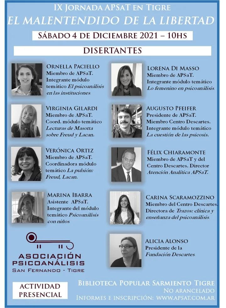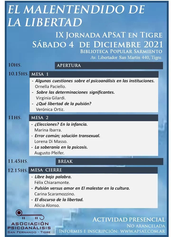 Bajo la consigna ‘El malentendido de la libertad’, la APSaT llevará a cabo la IX Jornada abierta y gratuita en la Biblioteca Popular Sarmiento (Av. Libertador Gral. San Martín 440, Tigre). La misma se llevará a cabo el sábado 4 de diciembre de 10 a 13.30hs.