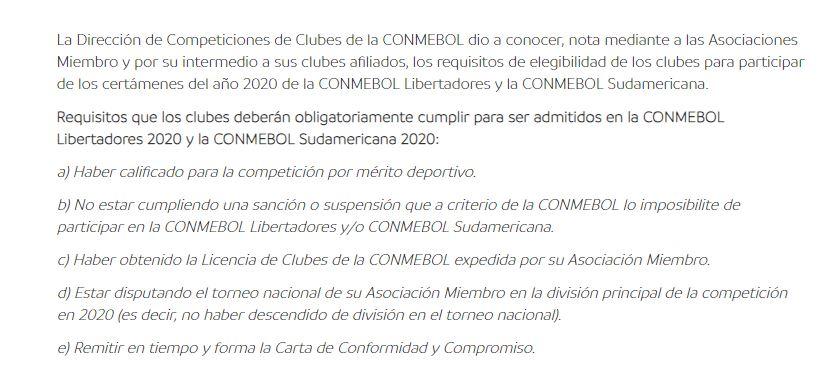La Confederación Sudamericana de Fútbol emitió un comunicado a través del cual hizo oficial los requisitos para participar de la Copa Libertadores y la Copa Sudamericana en 2020, y entre sus puntos prohíbe la participación de los equipos que no jueguen en la Primera división de sus respectivas ligas.