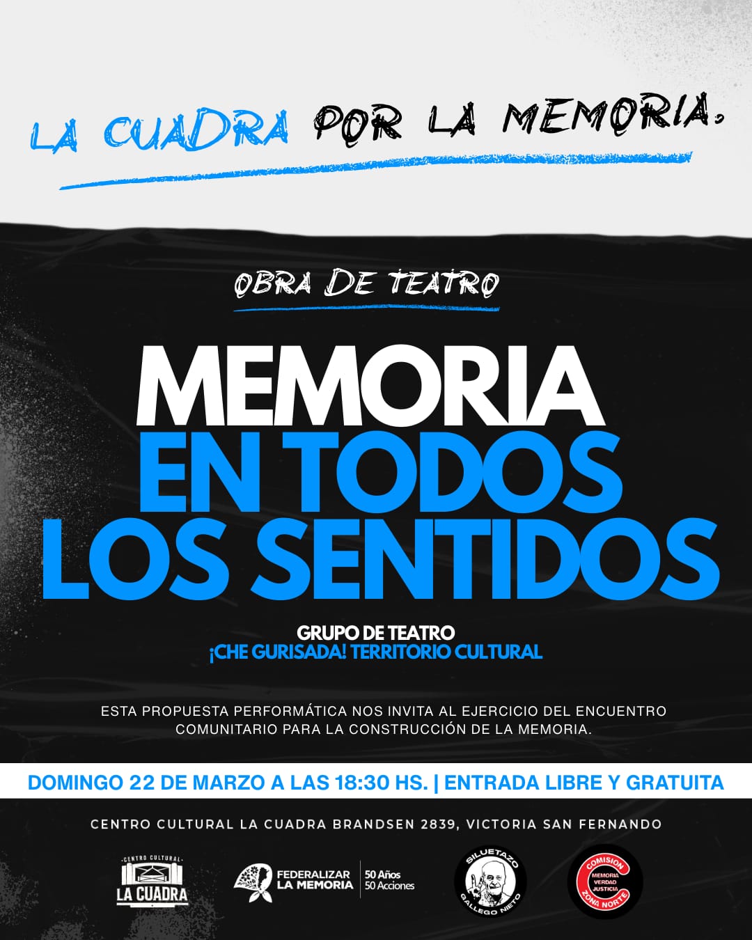 Para cerrar el fin de semana, y en vísperas de un nuevo aniversario del 24 de marzo, el domingo 22 a las 18:30h se presentará la obra ‘Memoria en todos los sentidos’.