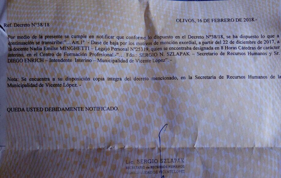 La respuesta no se hizo esperar y al otro día recibió una carta documento de despido del municipio de Vicente López donde cumplía funciones de docencia en el Centro de Formación Profesional.