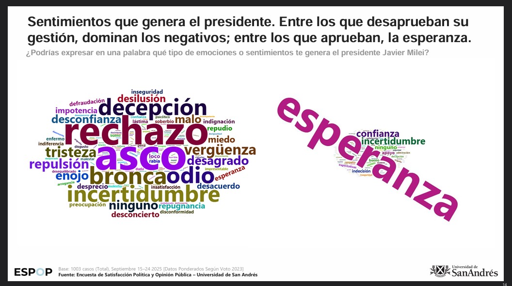Entre quienes desaprueban dominan emociones negativas como “asco”, “bronca”, “decepción”, “miedo”, “rechazo”, mientras que entre quienes aprueban predomina la “esperanza”.