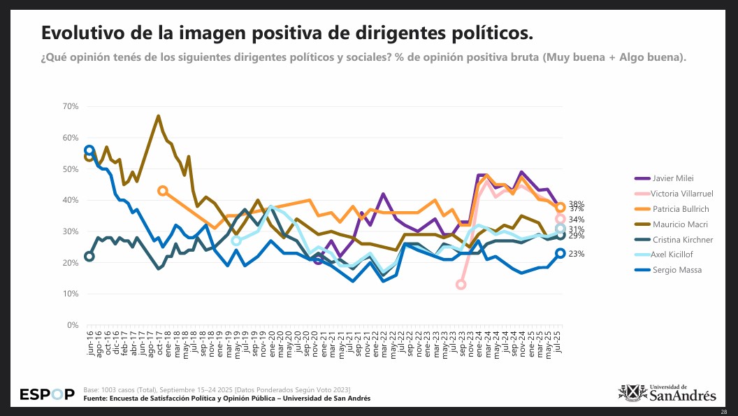 En cuanto a la imagen positiva de dirigentes políticos la medición de Javier Milei, Victoria Villarruel y Patricia Bullrich va en descenso frente a una estabilidad de Axel Kicillof y Cristina Fernández de Kirchner y un crecimiento de Sergio Massa.