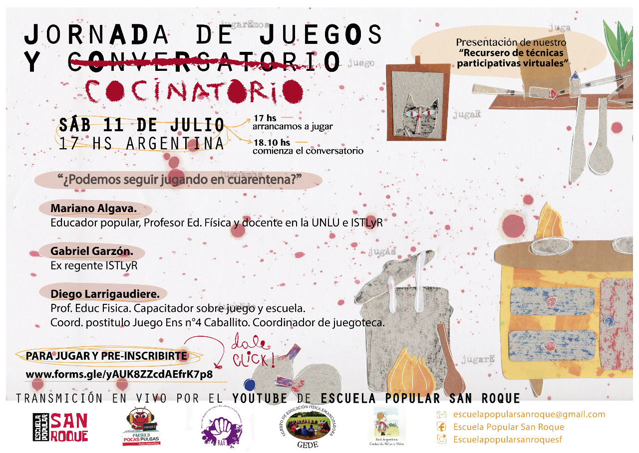 La Escuela Popular San Roque se autodefine como “un espacio educativo que trabaja con pibxs de los Barrios San Roque, San Ginés y Villa del Carmen”. En el contexto de la cuarentena a causa del coronavirus, decidieron armar un recursero, es decir, un compilado de distintas ideas para poder sacarle provecho a las herramientas digitales y continuar en contacto con los chicos a pesar de las circunstancias. Para darlo a conocer el sábado 11 de julio de 17 a 18 hs se llevará a cabo una jornada de juegos. Luego tendrá lugar un conversatorio “al que llamamos ‘cocinatorio’ por esta idea de construir el conocimiento colectivamente”, según cuenta Ailen Goyanes, una de las creadoras de la iniciativa. Ya hay más de doscientos inscriptos y participarán tres referentes vinculados al juego: Mariano Algava, Gabriel Garzón y Diego Larrigaudiere. El evento se transmitirá en vivo por el canal de Youtube de la Escuela Popular.