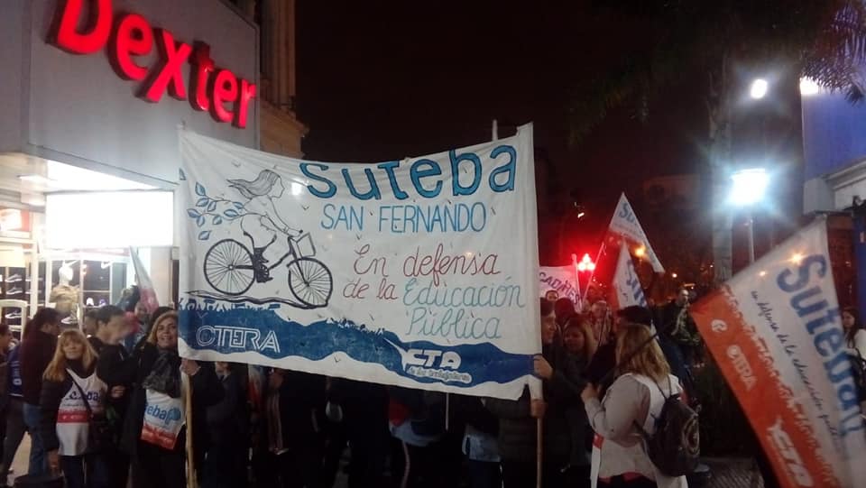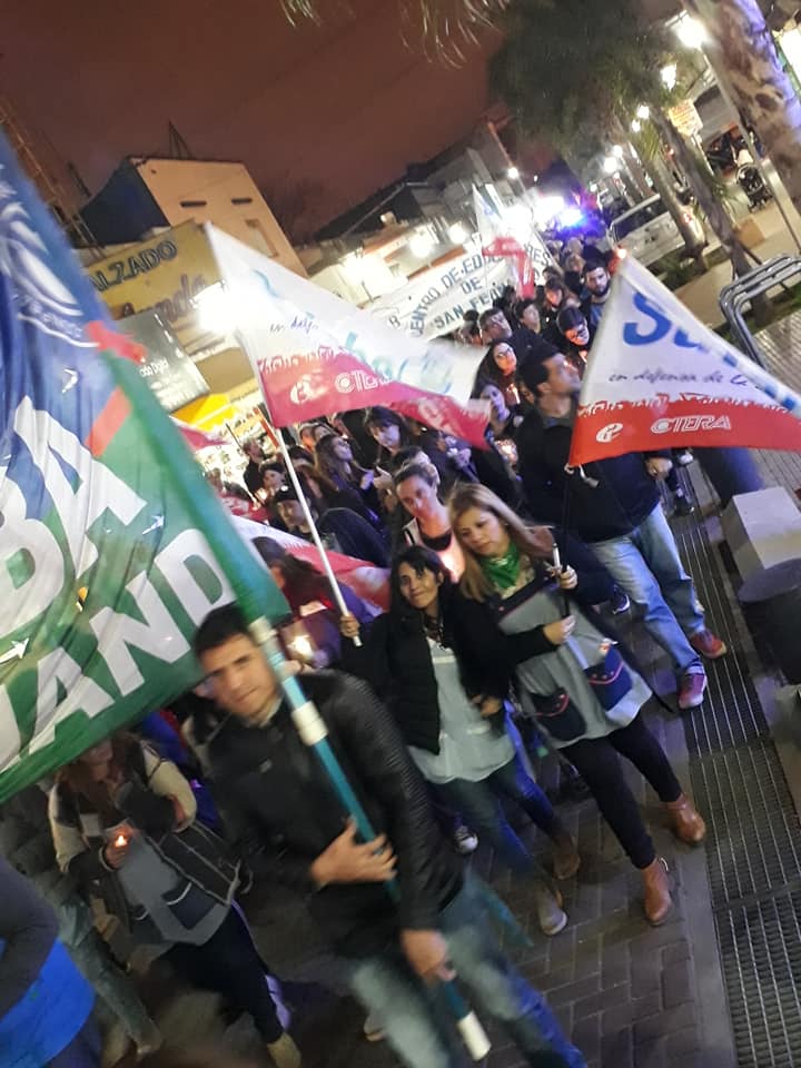 La Marcha de Antorchas convocada en repudio al secuestro y tortura de Corina De Bonis reunió a trabajadores de la educación de distintos puntos de la provincia. Suteba y Ctera convocaron bajo la consigna “Nunca Más”, en apoyo a la maestra agredida. La marcha también sirvió para reclamar justicia por Sandra Calamano y Rubén Rodríguez, las dos víctimas fatales de la explosión por pérdida de gas en la escuela 49 de Moreno, el mismo distrito donde De Bonis fue tajeada con un punzón.
