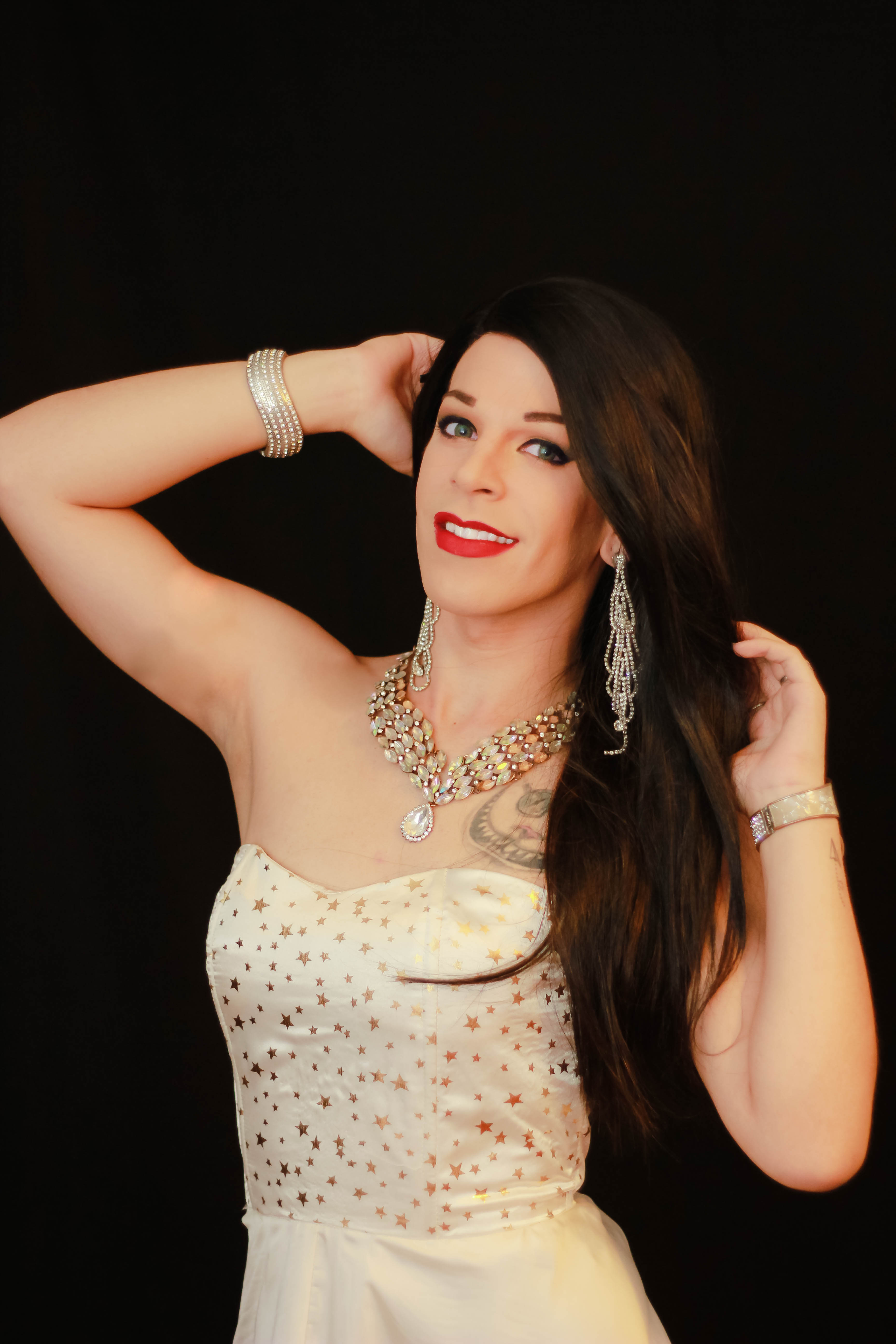 Nosotras siempre craneamos muy holywoodense. La cabeza del puto es ‘quiero un brillo espectacular así en la cara’ y decis de dónde lo saco. Después terminás con un brillito acá (se toca la cara) pero lo vamos moldeando. De algo maravilloso sale algo muy copado a nuestro alcance porque no tenemos a alguien que ponga el dinero para explotar el show. Es a pulmón. Tratamos de que todo quede coordinado, bien, estético. Nos encargamos hasta del vestuario de los bailarines.
